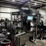 La linea è equipaggiata con un'etichettatrice PE, modello Simple cut KS177, con senso di rotazione antiorario e piattelli a camma elettronica, e una stazione roll feed per l'etichettatura delle bottiglie.
