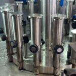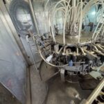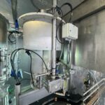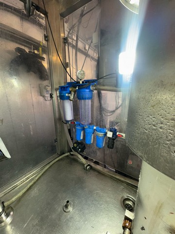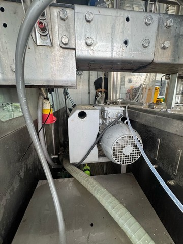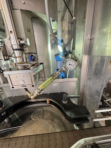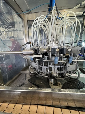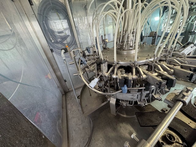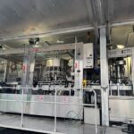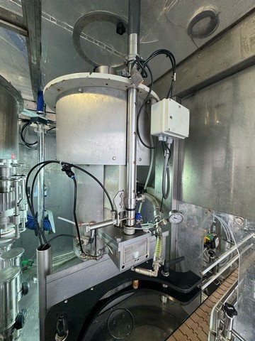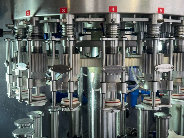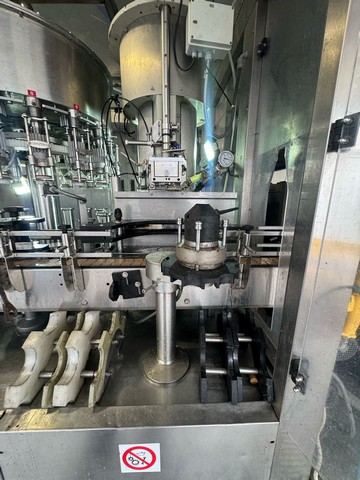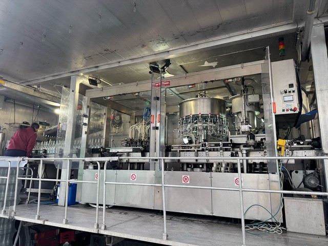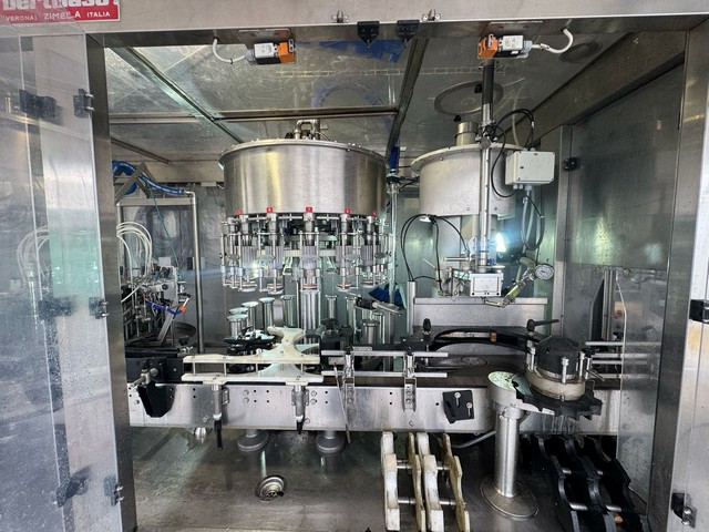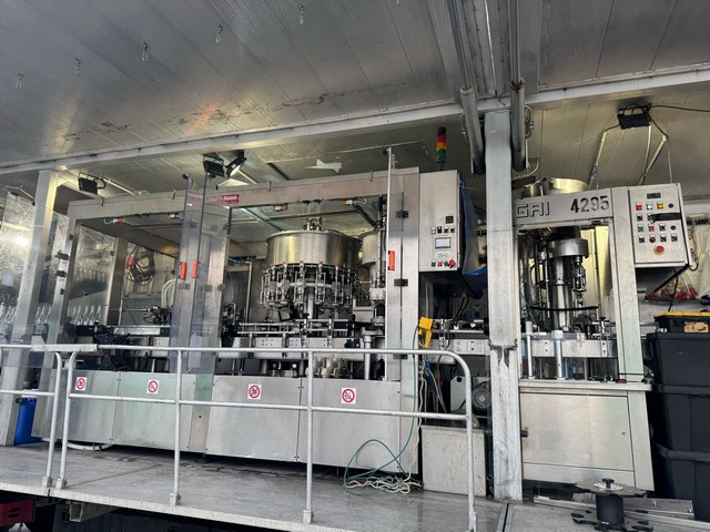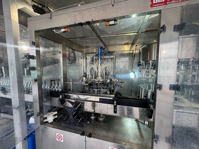 Monoblocco di riempimento Bertolaso 16.16.1 Usato del 2003 è progettato per una produzione oraria di 3.000 bph. La macchina utilizza bottiglie di vetro e comprende una sciacquatrice con 16 pinze, dotata di ugello fisso e doppio trattamento, che permette di selezionare tra acqua e gas inerte o Aira. La riempitrice è equipaggiata con 16 valvole che utilizzano un tipo di riempimento a leggera depressione e presenta valvole meccaniche, oltre a funzioni di auto-livello e sanitizzazione.